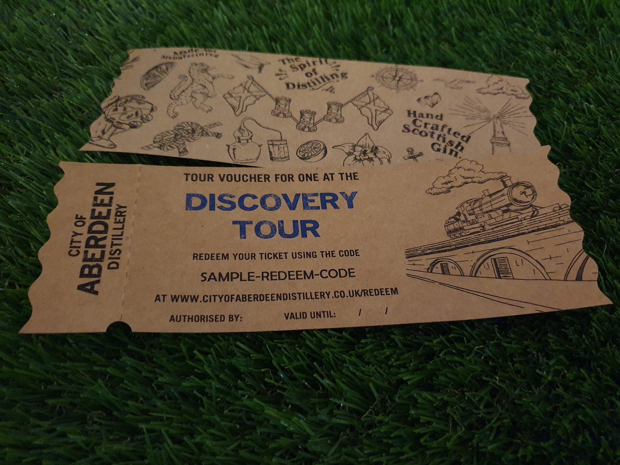 Our tour vouchers are made to order in-house and hand crafted. It is created as an old-style railway ticket with notches and perforations.